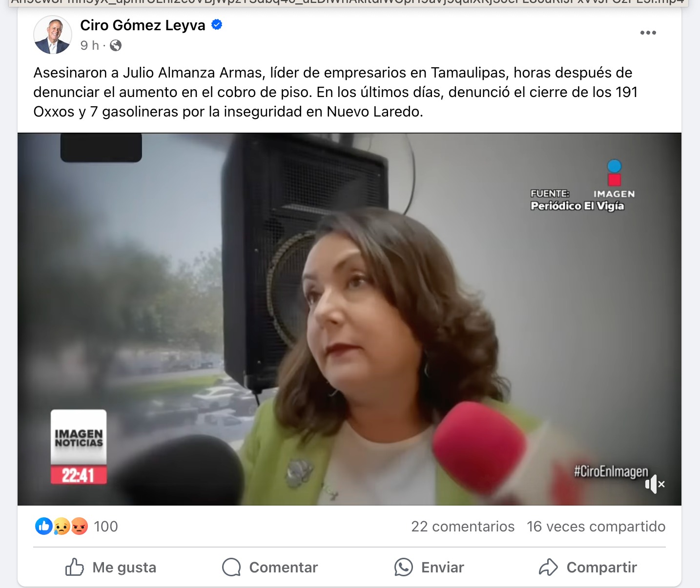 Julio César Almanza Armas, había declarado en medios de comunicación nacionales, su opinión sobre el cierre de las tiendas Oxxo en Nuevo Laredo, afectando la imagen política de la alcaldesa morenista Carmen Lilia Canturosas Villarreal, quien no se ha pronunciado al respecto.