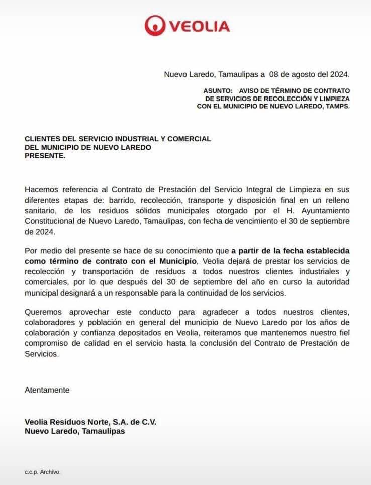 «A partir de la fecha establecida como término de contrato con el Municipio de Nuevo Laredo, Veolia dejará de prestar los servicios de recolección y transportación de residuos a todos nuestros clientes industriales y comerciales, por lo que después del 30 de septiembre del año en curso la autoridad municipal designará a un responsable para la continuidad de los servicios», expresó la propia empresa Veolia en un comunicado, con fecha del 08 de agosto del presente año.