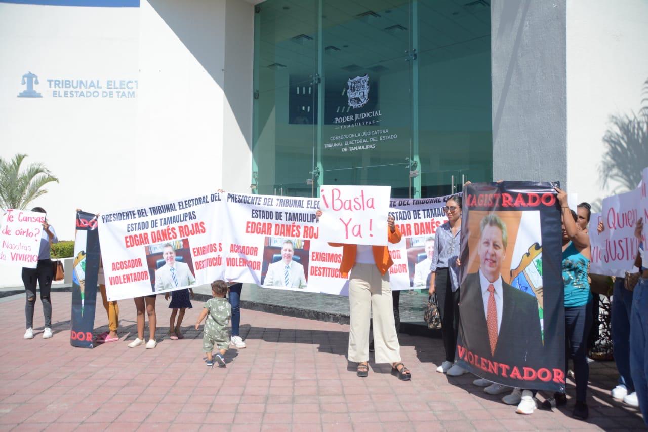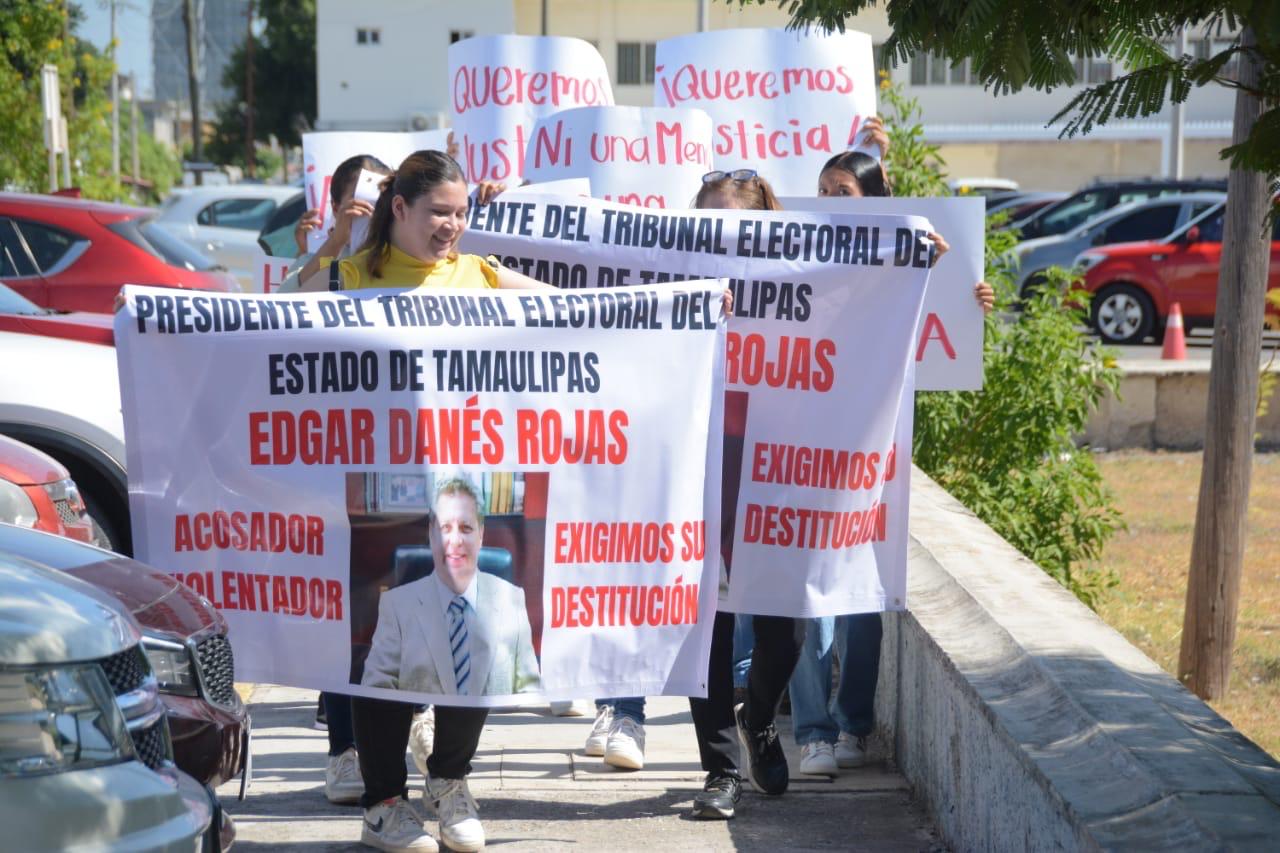 Ciudad Victoria, 15 de agosto de 2024.- Cansados de que las autoridades no hagan caso, esta mañana un grupo de manifestantes acudió hasta la sede del Tribunal Electoral del Poder Judicial de Tamaulipas para protestar contra el magistrado Edgar Danés Rojas, quien tiene denuncias por acoso sexual en contra de una ex trabajadora de dicho sitio.