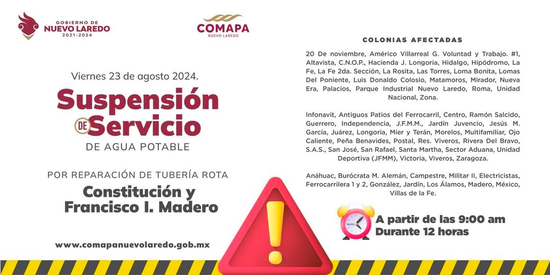 Las colonias afectadas por el corte de agua potable son; 20 De noviembre, Américo Villarreal G. Voluntad y Trabajo. #1, Altavista, C.N.O.P., Hacienda J. Longoria, Hidalgo, Hipódromo, La Fe, La Fe 2da. Sección, La Rosita, Las Torres, Loma Bonita, Lomas Del Poniente, Luis Donaldo Colosio, Matamoros, Mirador, Nueva Era, Palacios, Parque Industrial Nuevo Laredo, Roma, Unidad Nacional, Villas De La Fe, Zona.