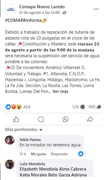 Y en forma sarcástica y burlona, la COMAPA escribió en el único mensaje de alerta del corte de agua “se estima que los trabajos tomen alrededor de 12 horas, por lo que te recomendamos 𝐫𝐞𝐜𝐨𝐥𝐞𝐜𝐭𝐚𝐫 𝐚𝐠𝐮𝐚 𝐬𝐮𝐟𝐢𝐜𝐢𝐞𝐧𝐭𝐞 para cubrir las necesidades básicas durante este periodo”.