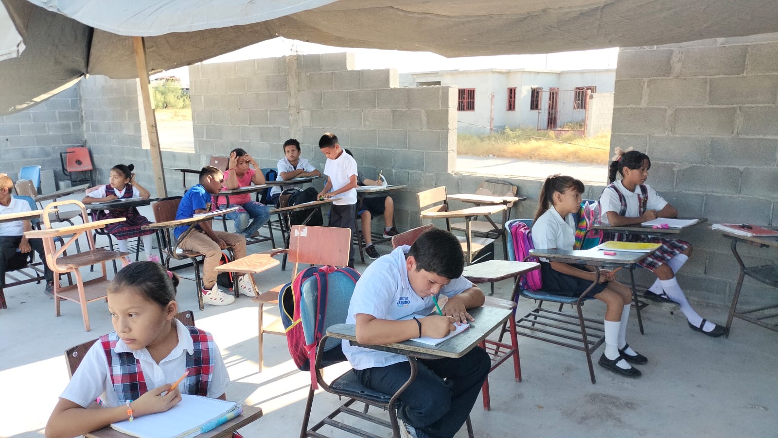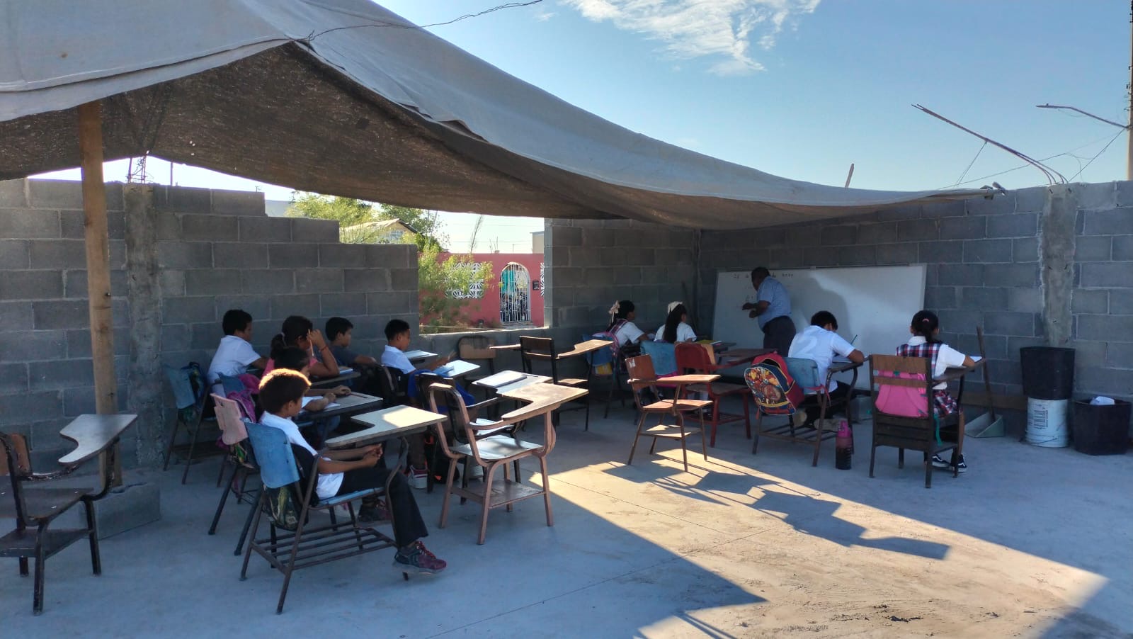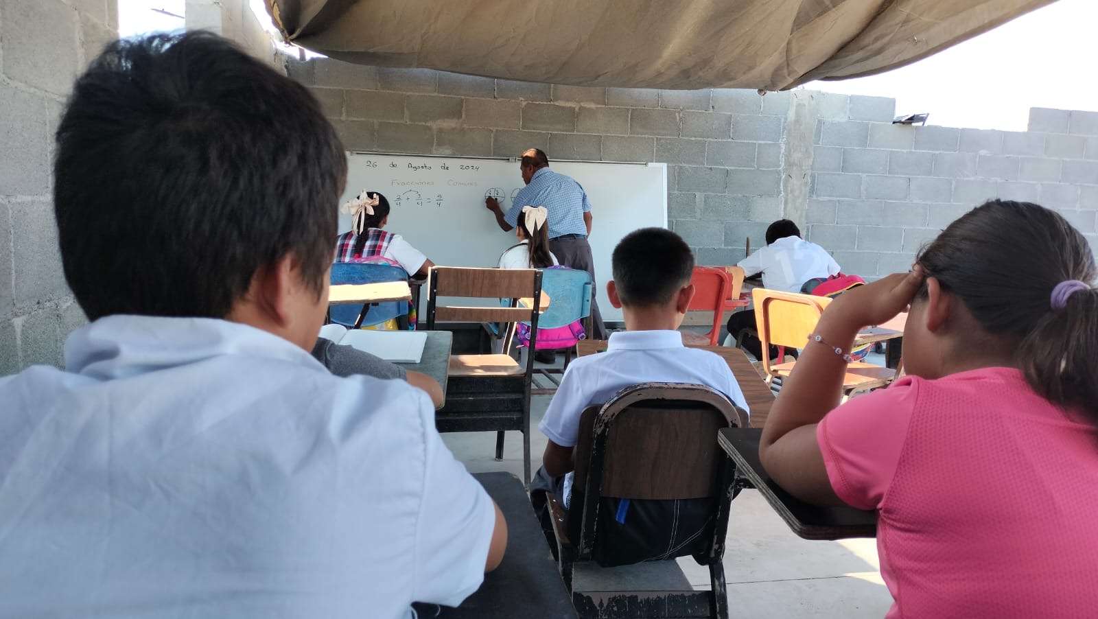 Los 47 estudiantes de esta escuela inician su ciclo escolar bajo carpas improvisadas, expuestos a temperaturas extremas y a los riesgos que conlleva el entorno no adecuado para un centro educativo. Las carpas, que apenas ofrecen un refugio rudimentario del sol y la lluvia, están situadas en un terreno lleno de maleza y con un peligro latente de encuentros con víboras, alacranes y otros animales venenosos. Los niños y niñas, entre los que se encuentra un pequeño con uniforme de administraciones pasadas, comienzan su año escolar en un salón que solo cuenta con dos paredes y techos de lona.