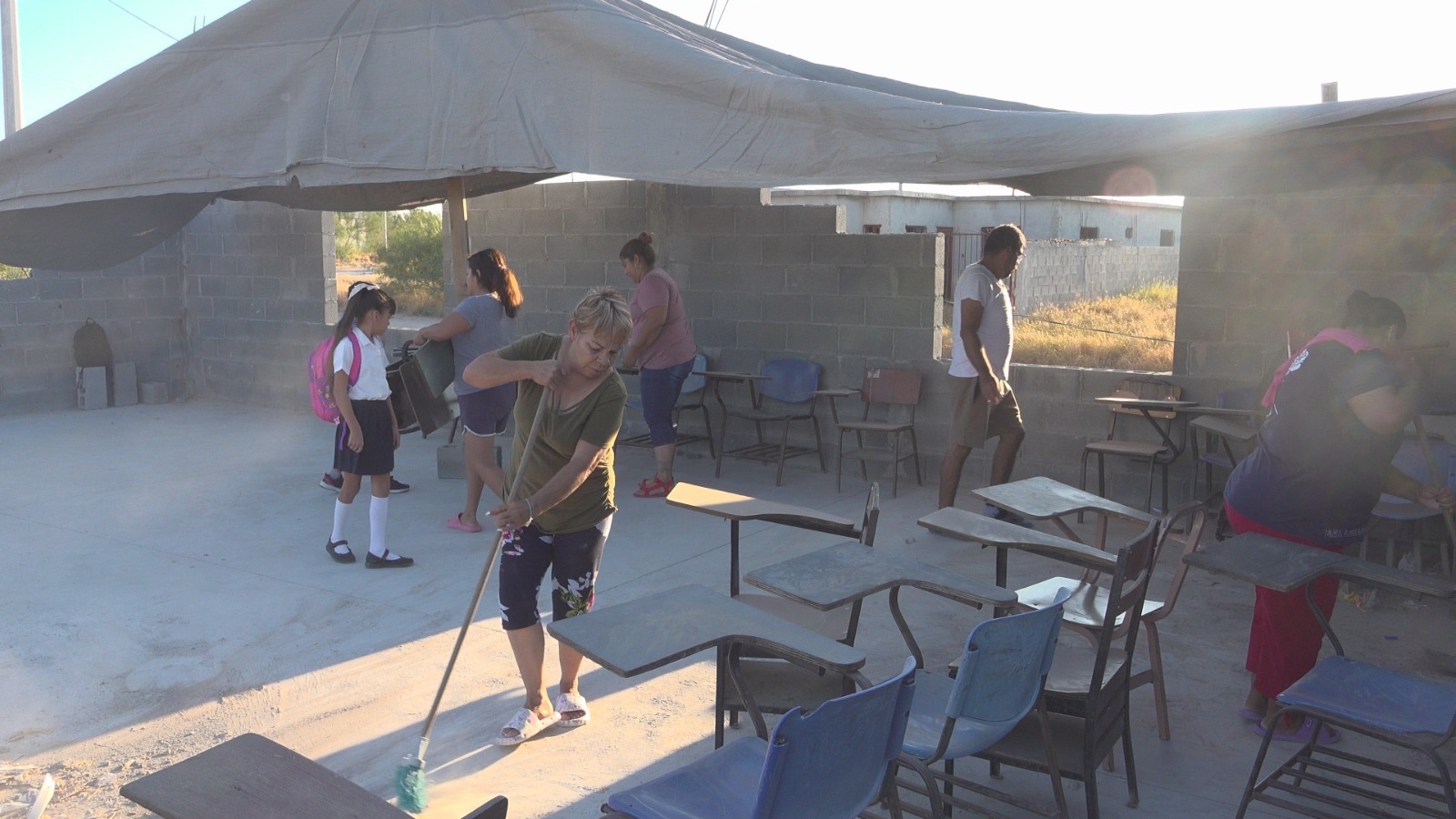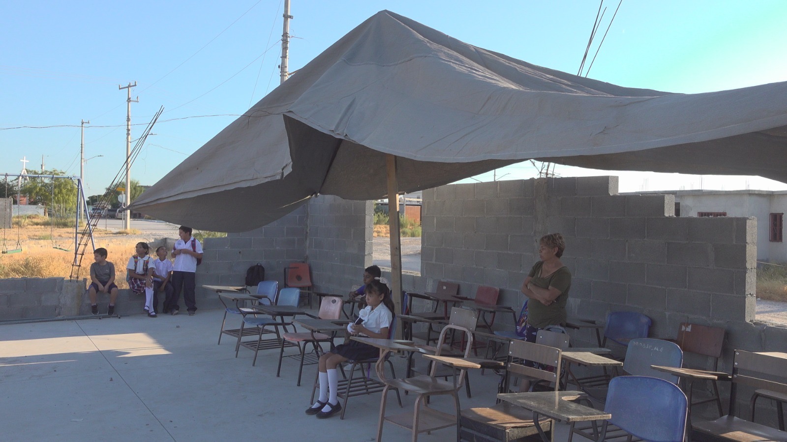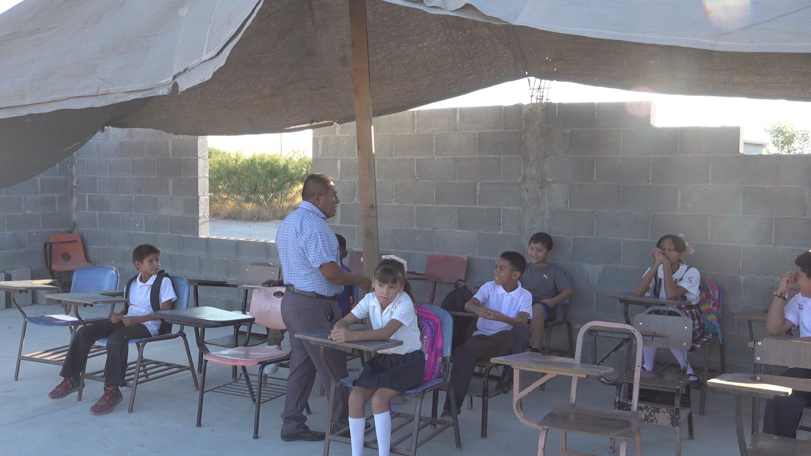 Los 47 estudiantes de esta escuela inician su ciclo escolar bajo carpas improvisadas, expuestos a temperaturas extremas y a los riesgos que conlleva el entorno no adecuado para un centro educativo. Las carpas, que apenas ofrecen un refugio rudimentario del sol y la lluvia, están situadas en un terreno lleno de maleza y con un peligro latente de encuentros con víboras, alacranes y otros animales venenosos. Los niños y niñas, entre los que se encuentra un pequeño con uniforme de administraciones pasadas, comienzan su año escolar en un salón que solo cuenta con dos paredes y techos de lona.