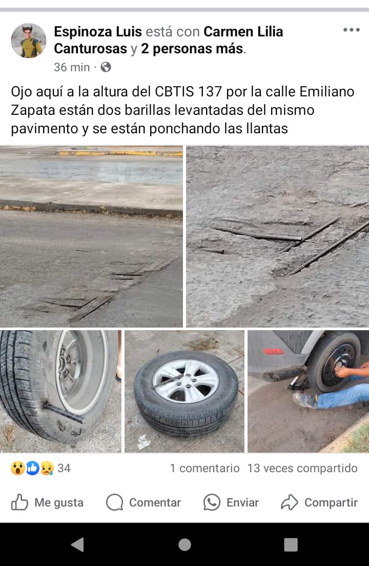 En una publicación a las 7:33 a.m. de hoy, Espinoza Luis advirtió en Facebook sobre un peligro adicional en la calle Emiliano Zapata, a la altura del CBTIS 137. “Ojo aquí a la altura del CBTIS 137 por la calle Emiliano Zapata están dos barillas levantadas del mismo pavimento y se están ponchando las llantas”, indicó, resaltando otro problema causado por el deficiente mantenimiento de las obras viales.