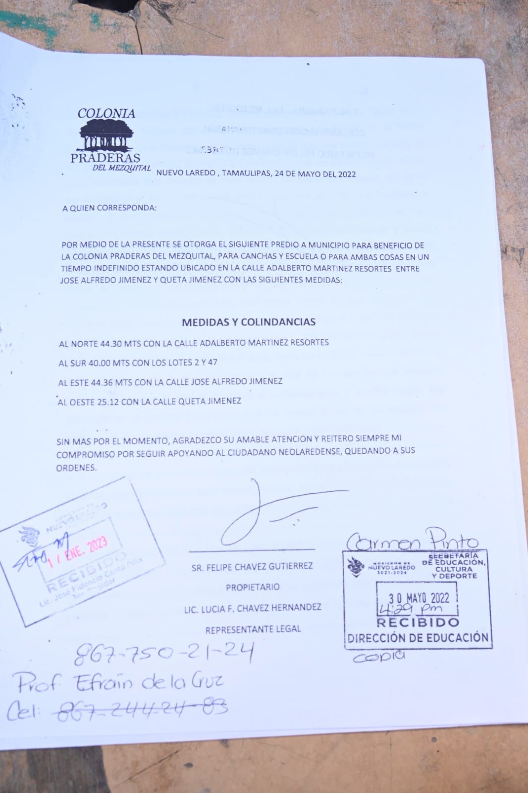 Un aspecto fundamental en este proyecto es el terreno donde se está construyendo la escuela, que fue donado por el ciudadano Felipe Chávez al Municipio en mayo de 2022. Esta donación fue formalizada y certificada por el Notario Público 323, Atimio Puente Rodríguez, garantizando que los terrenos no son irregulares. A pesar de esta clara legalidad, el Gobierno Municipal no ha tomado acción para desarrollar el terreno y proporcionar las infraestructuras necesarias.