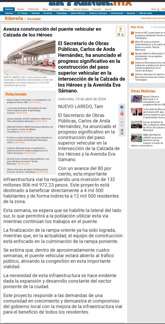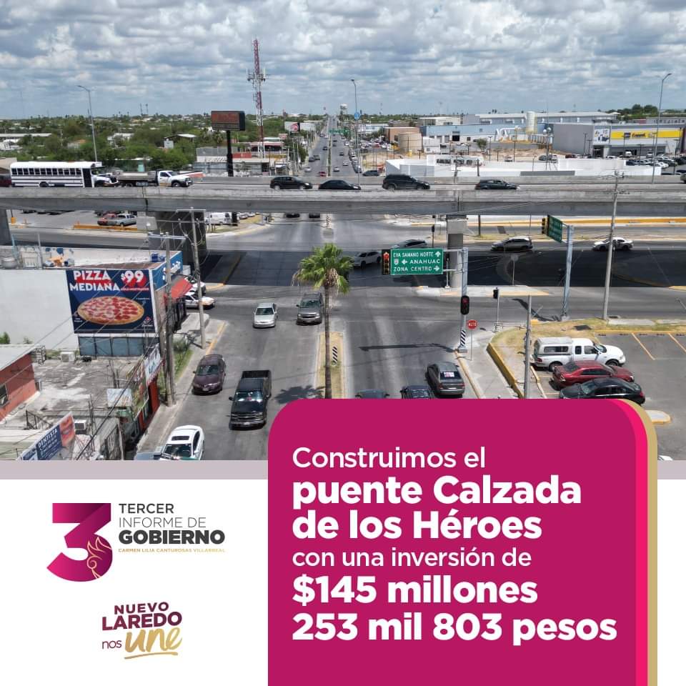 Nuevo Laredo, 11 de septiembre de 2024 — La administración municipal encabezada por Carmen Lilia Canturosas desvio fondos destinados a 48 obras públicas en diversas colonias de la ciudad para financiar la construcción del puente de la Calzada de los Héroes, obra que ha generado controversia no solo por su utilidad, sino también por el incremento en su costo y las acusaciones de favoritismo hacia la constructora Tracotamsa.