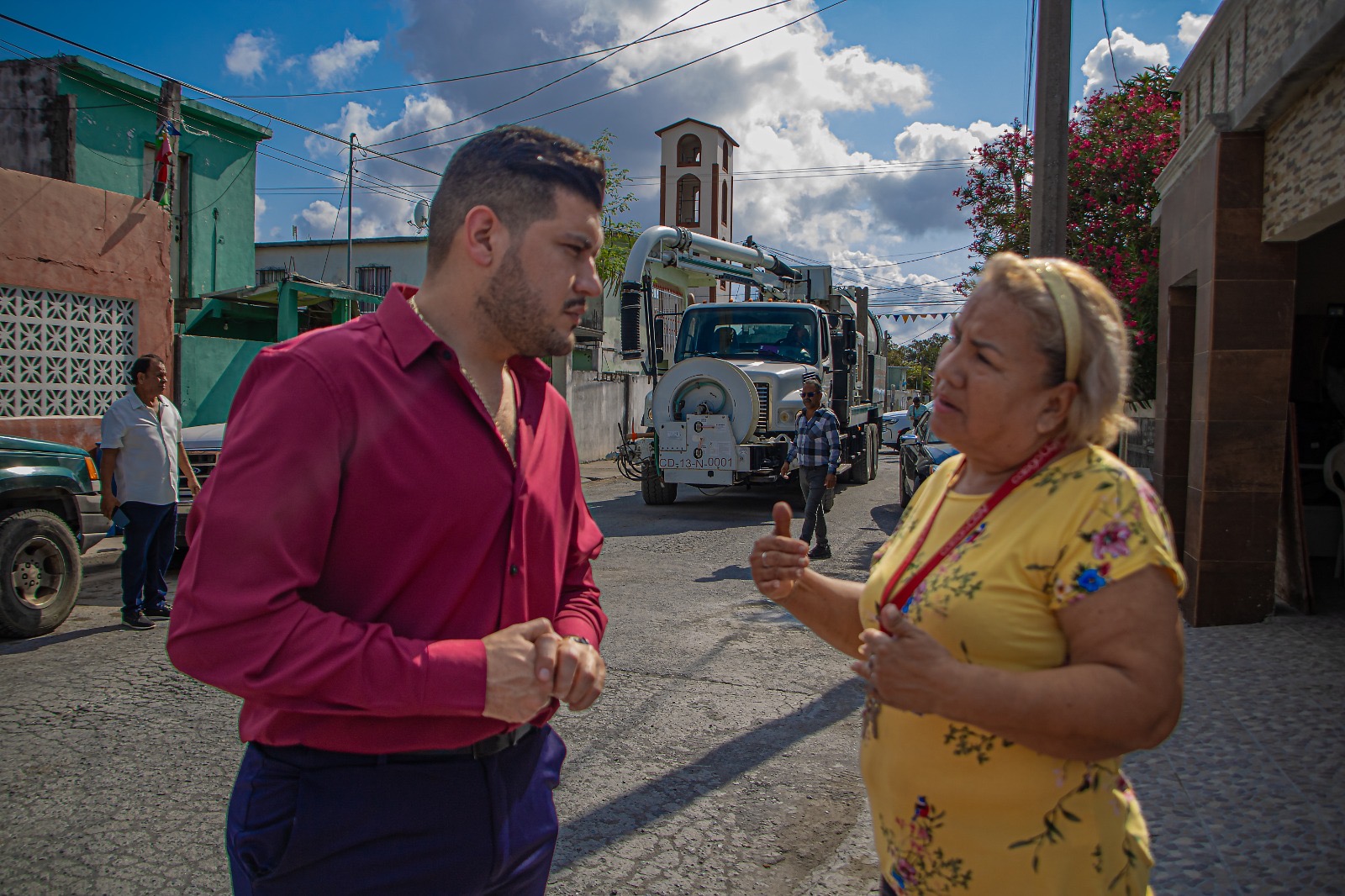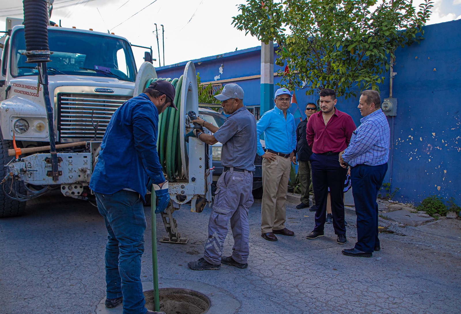 Durante el recorrido, el alcalde constató el uso de camiones vactor, equipo especializado para la limpieza y mantenimiento del sistema de drenaje, con el objetivo de prevenir inundaciones y mejorar el flujo en las redes de agua y drenaje de la ciudad.
