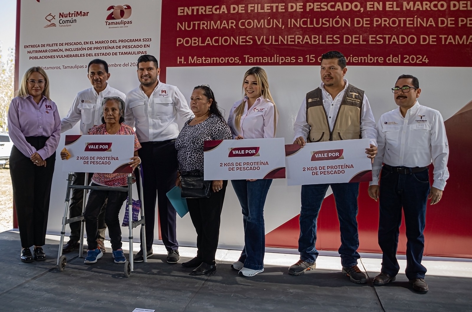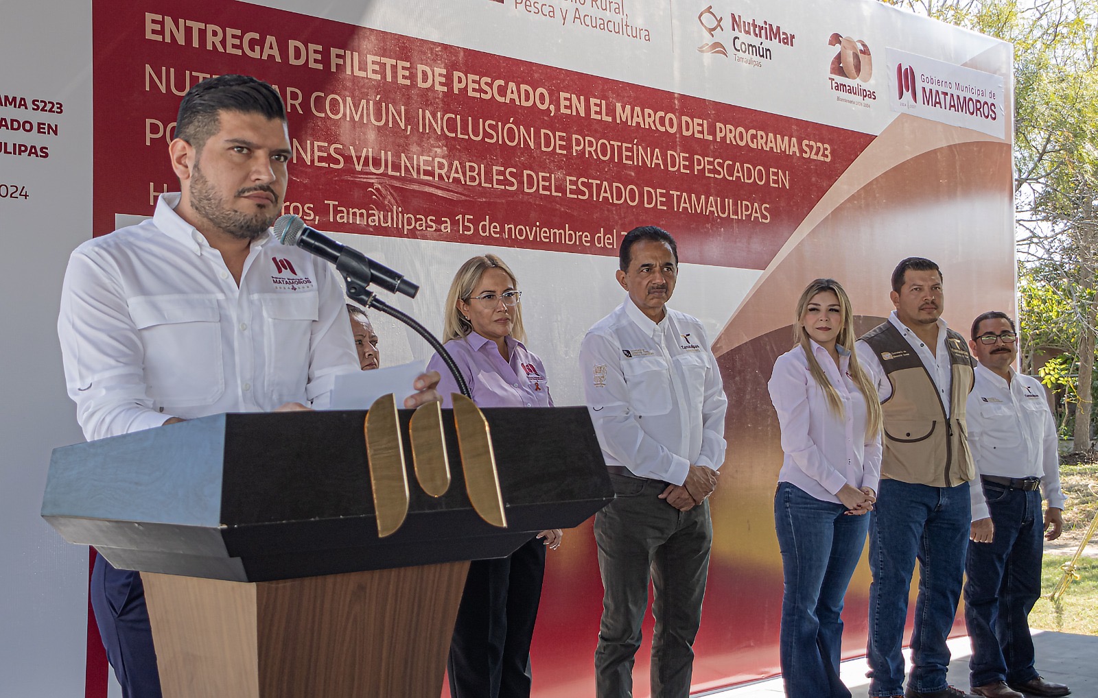 Matamoros, Tamaulipas. En un esfuerzo por apoyar la nutrición y mejorar la calidad de vida de familias en situación vulnerable, se llevó a cabo la entrega de proteína de pescado como parte del programa S23 Nutrición Común, impulsado en el estado de Tamaulipas. El evento se realizó en la colonia Cabras Pintas y estuvo encabezado por el presidente municipal, Lic. José Alberto Granados Fávila, junto a destacados representantes estatales y municipales.