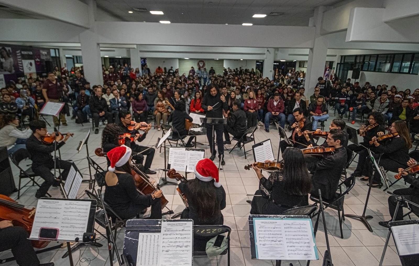 El ameno concierto navideño estuvo a cargo de la Camerata del Colegio San Juan Siglo XII y el Taller de Ópera, los cuales son dirigidos por Orlando Mora y la Mtra. Jessica Lustenberger.
