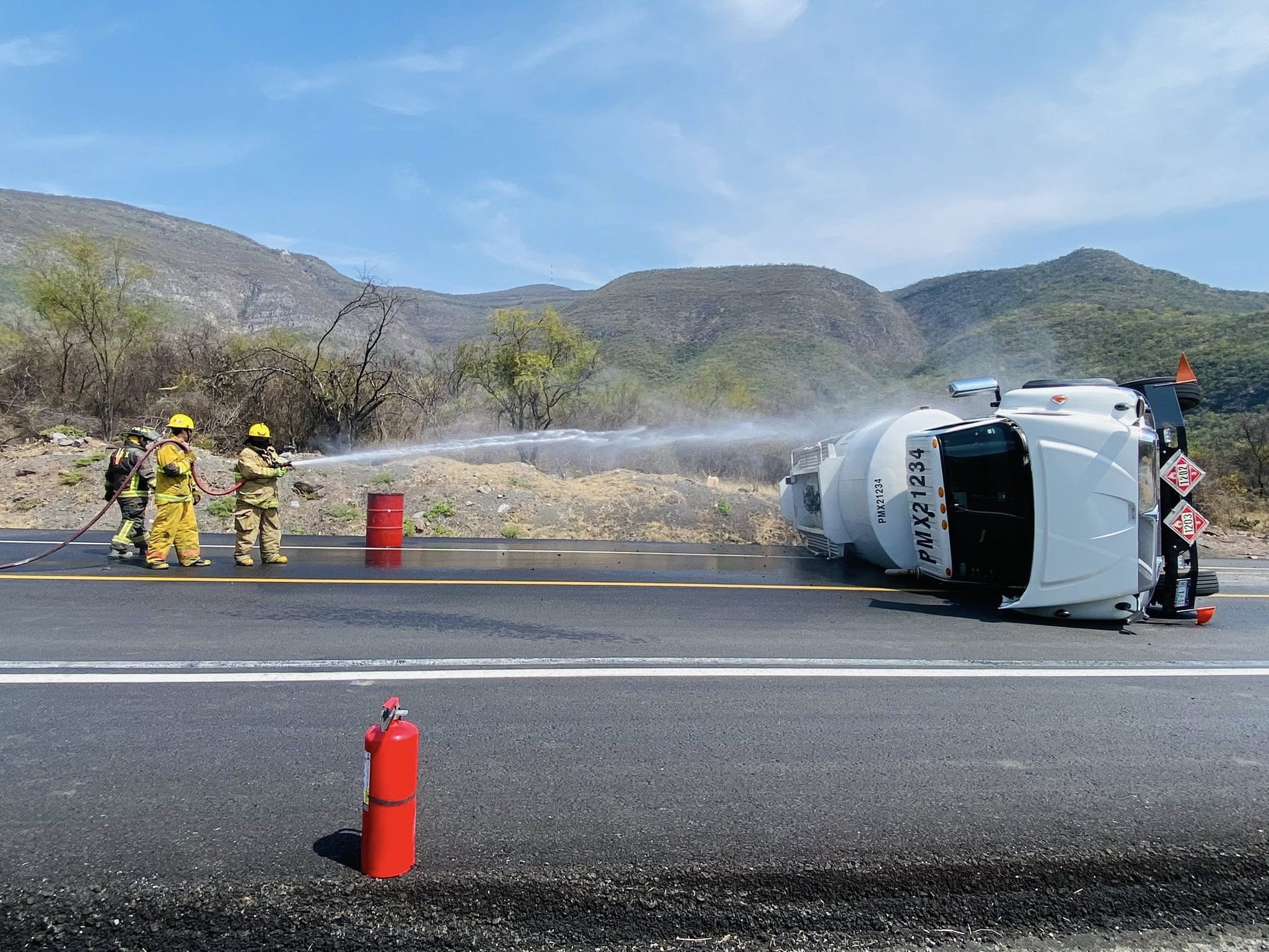 Bomberos de Protección Civil Tamaulipas junto a personal de Protección Civil Jaumave atendieron la volcadura de una pipa de PEMEX registrada en el km 22 de la carretera Rumbo Nuevo, donde se presentó fuga de combustible.